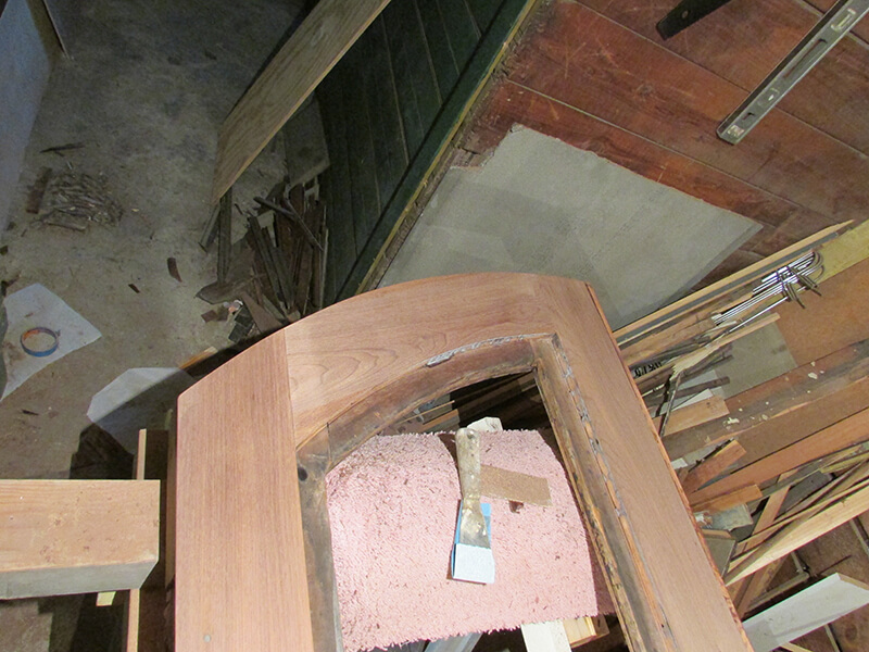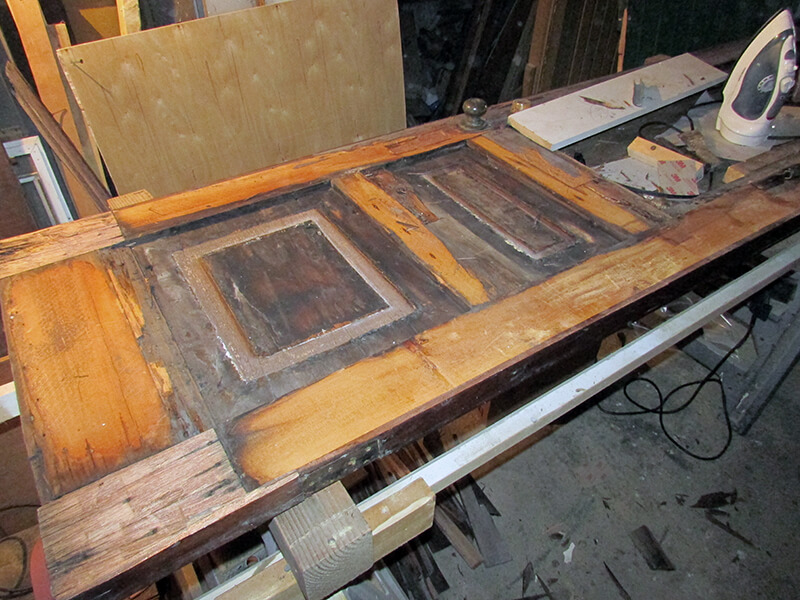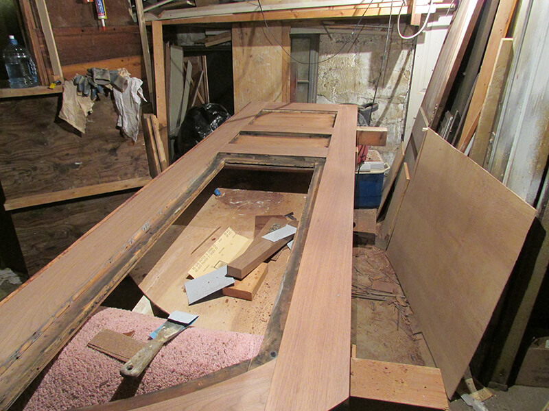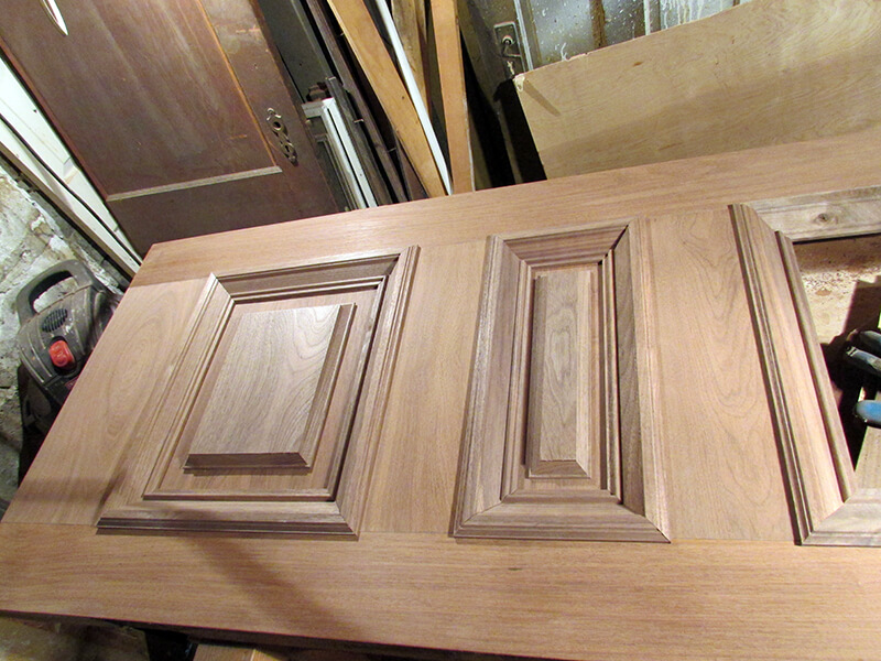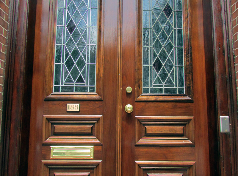 The exterior veneer and trim were completely rotted on these doors in the South End of Boston. We had other walnut doors which we removed the veneer from and reused. New trim was also required and after rebuilding the doors they were coated with three coats of varnish. The surround was stripped, plinth boxes were added and three coats were also applied. Brass was polished as well.