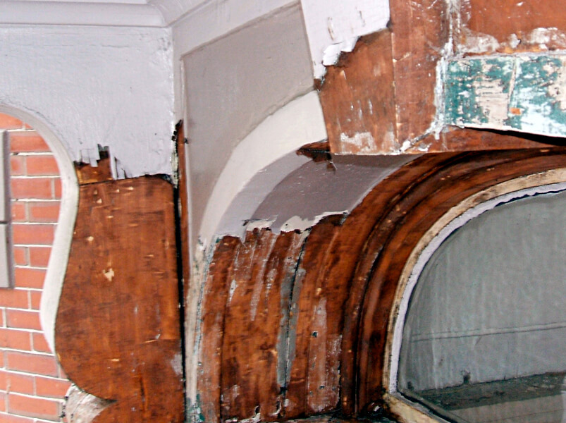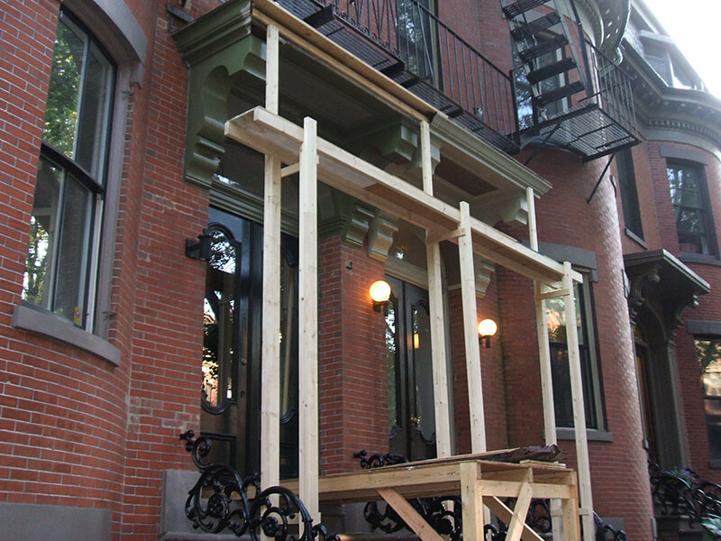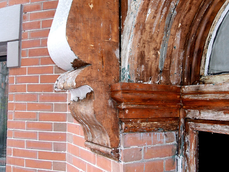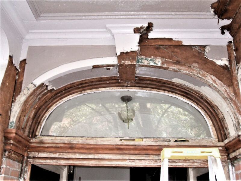 To begin this project the 120 year old paint was removed with heat guns. Repairs were made to crown molding and rubber roof before the doors and surround were painted.