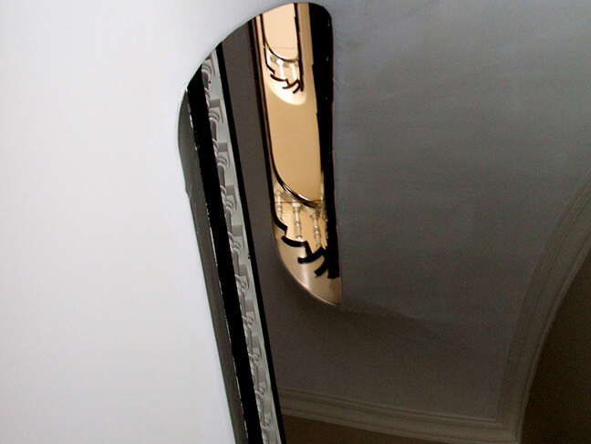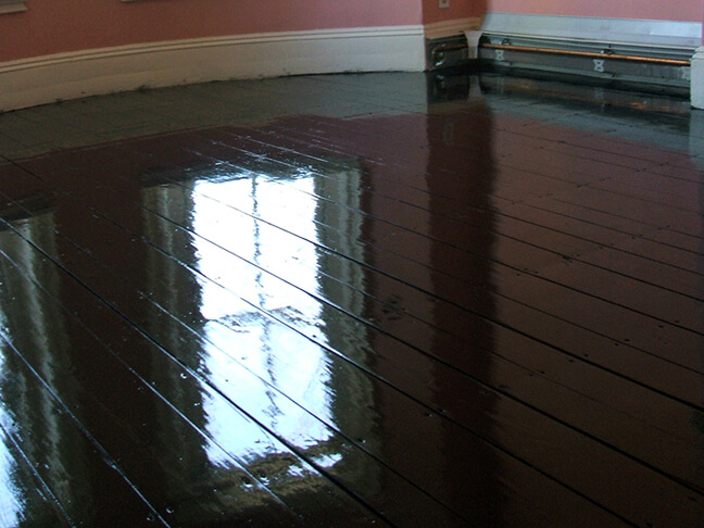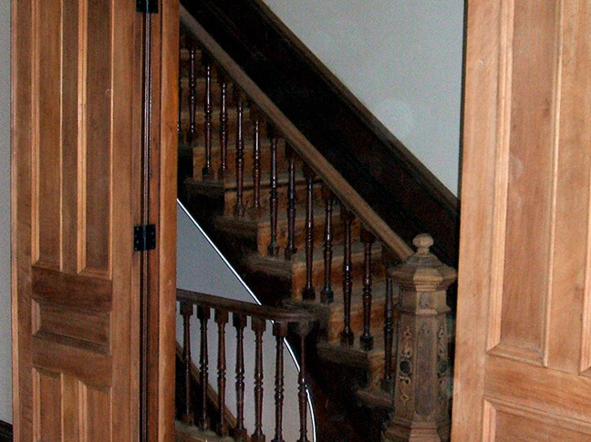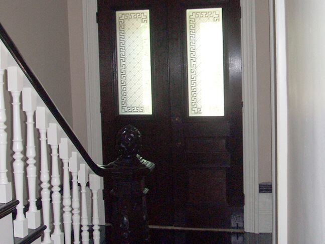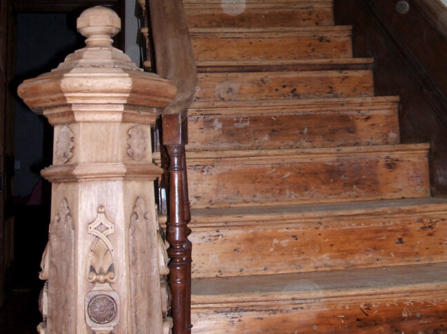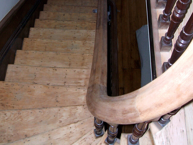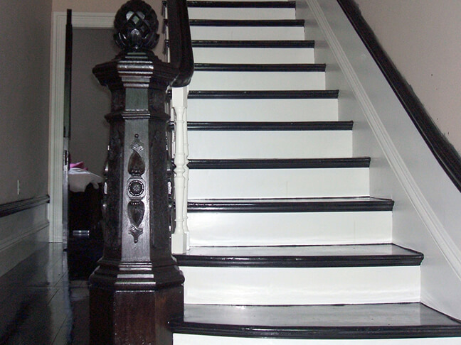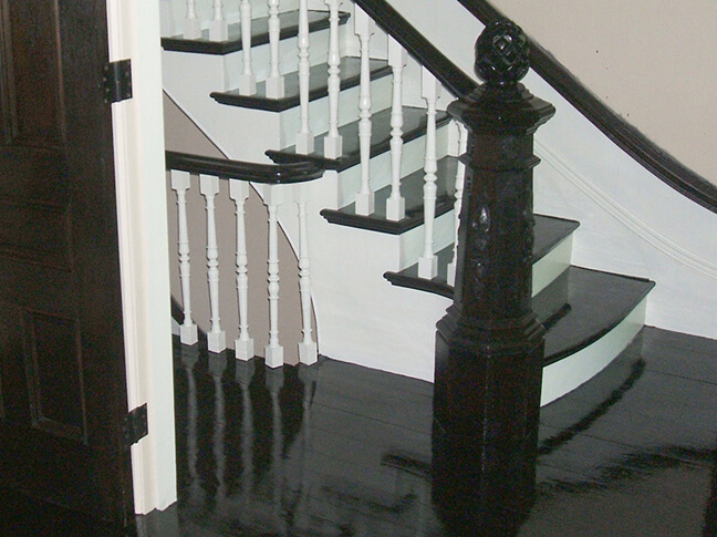 The owners of this 5 story in the South End wanted all the wood floors (oak and pine), stair treads, newel post, balustrade and all the walnut doors on the parlor levels, stained black. To accomplish this the wood was sanded or stripped, dyed black then stained black and top coats of polyurethane or varnish were applied. The balusters, wainscoting and risers on the staircase were painted white.